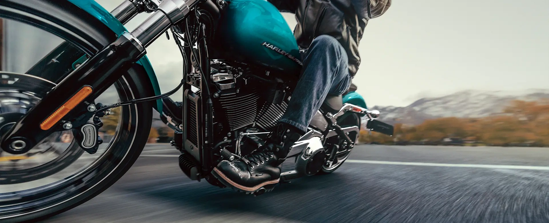 A Breakout 2026 chama atenção antes mesmo de ligar o motor, graças a dois novos acabamentos de fábrica: Blood Orange e Teal Thunder. Eles se juntam às cores Vivid Black, Dark Billiard Gray e Iron Horse Metallic, cada uma ousada o suficiente para levar o nome Breakout.